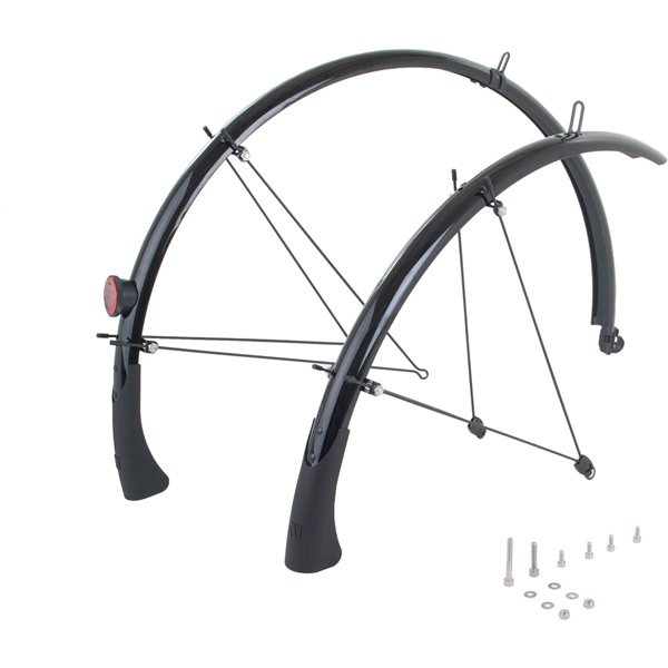 | Description | A high quality, great value, set of full length mudguards 3.2mm Stainless Steel Stays and fittings for long life Virtually unbreakable polycarbonate guard material Available in a range of widths, sizes and colours A must have extra for any commuter bike Approx 520 grams for full set with fittings Rear Reflector Rubber Mudflaps Size Option - 700 x 38mm, 700 x 46mm, 700 x 55mm, 700 x 60mm, 700 x 68mm |