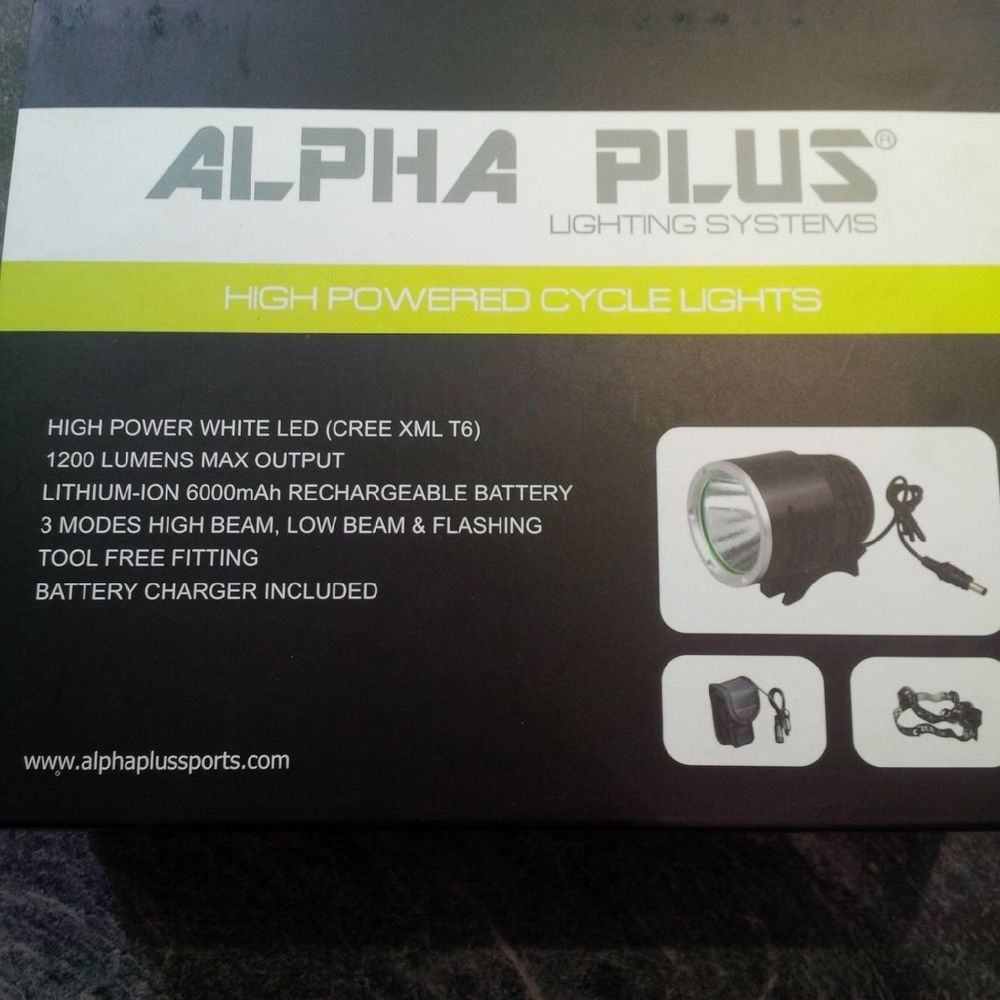 | Description | Alpha Plus High Power Cree XML T6 LED High Power Cree White LED 1200 Lumens Max Output Lithium-Ion 6000mAh Rechargeable Battery Function : High Beam-Low Beam-Flash-Off 3.5 Hours Burn Time - High Beam 100v-240v Charger Included HandleBar Bracket & HeadBand Included Easy-Fit Bracket- No Tools Required |