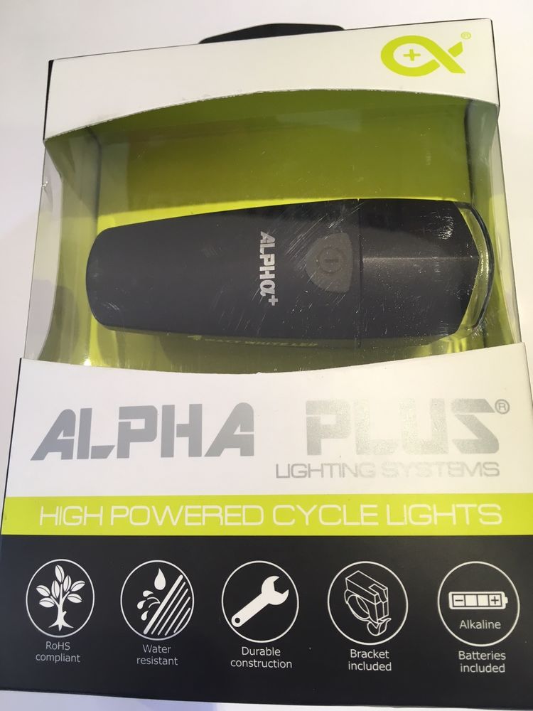 | Description | ALPHA PLUS 1w Ultra Bright White LED Front Light Handlebar Bracket Included Batteries Included Modes Flash or Constant Up to 30/60 hours of burn time Visible up to 1000m |