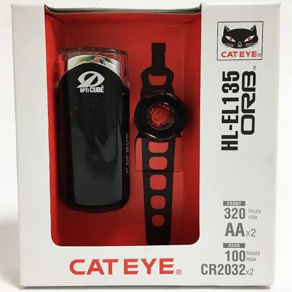 | Description | CATEYE EL135 & ORB FRONT & REAR LIGHT SET Dependable battery powered lights with a modern twist A great value set of dependable battery powered lights with formidable run times Replacing the EL-130 front & Omni 3 rear light set, this new combination offers greater outputs on both lights and provides a significant saving over buying the same lights separately EL-135 Front Mode: Output, Runtime Constant: 25 Lm, 80 hrs Flashing: 25 Lm, 320 hrs 2 x AA batteries & FlexTight bracket included ORB Black Rear Mode: Output, Runtime Constant: 5 Lm, 50 hrs Flashing: 5 Lm, 100 hrs Slow Flashing: 5 Lm, 100 hrs 2 x 2032 batteries included |