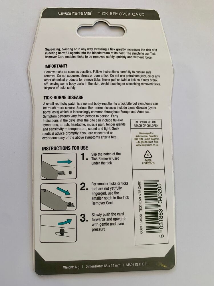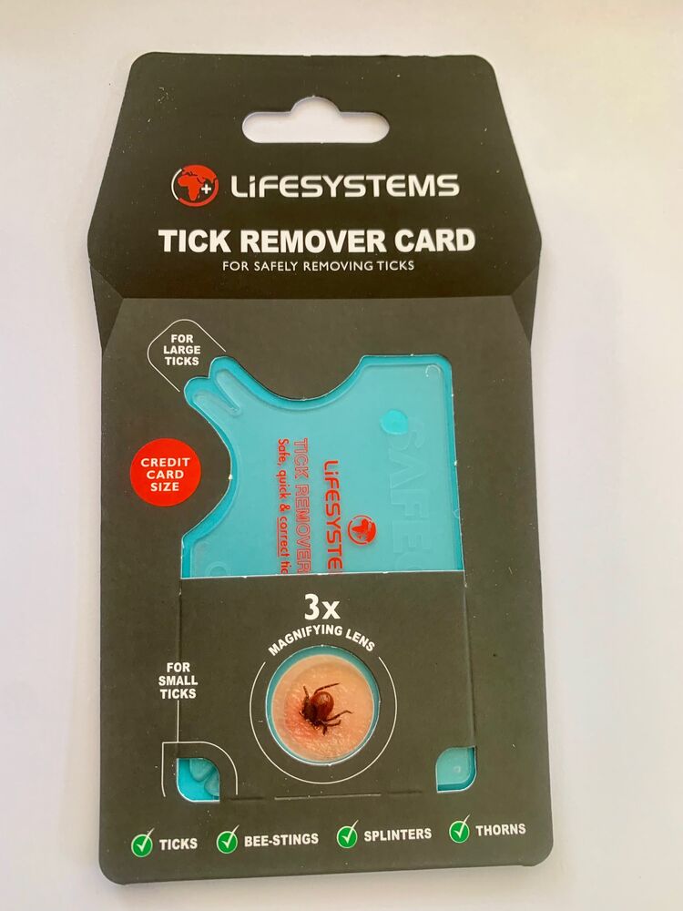 | Description | A credit card sized tick remover which will fit in your wallet, pocket or trail bag Lyme disease, transmitted via ticks, has become an increasing problem in Europe Although preventative measures can be taken, occasionally ticks will attach themselves to you The tick removal card has been designed to ensure the whole tick is removed safely Featuring a magnifying lens and two different sizes removal tools for different sized ticksDimensions 85 x 54mm Weight 6g |
