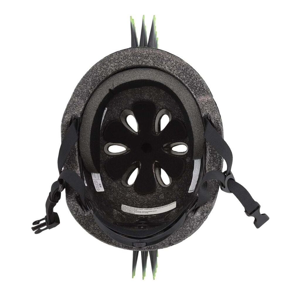 It also features an eye-catching 2-inch tall bendable black 3D mohawk with bright green tips. Perfect for tearing it up like a dinosaur on a bike, scooter or skateboard.