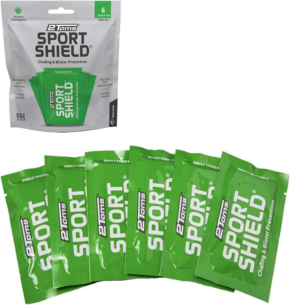 | Description | 6 - travel size towelettes with SportShield® liquid applied to it. Skin Guard & Chafing Prevention For Your Entire Body 100% Guaranteed! SportShield® is removed from the skin with soap and water (leaving absolutely no residue), and is ideal for use on the inside of thighs, over nipples, on feet, underarms, and under bra or athletic supporter straps. SportShield® performs with you under the most grueling conditions and will not rub off. It even works under wetsuits! SportShield® is a silicone-based anti-chafe product that is non-staining, non-toxic, non-greasy and be used daily. It contains no animal products. Ultra Running Magazine named 2Toms SportShield Top Pick Anti-Chafe! How to Apply Using SportShield® liquid roll-on or convenient towelettes, you apply a smooth, thin invisible coating to the skin. It can be applied any part of the body where skin is subjected to chafing by clothing and equipment pressure points. Some common chafe prone areas include: Between the arms and sides of the body Between upper thighs Groin area Over nipples Around back of heels Tops of toes Ingredients: Dimethicone, Aloe Vera Extract, Vitamin E |