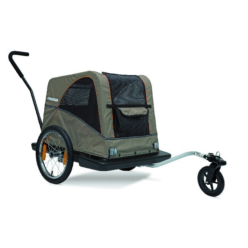 the Croozer Pet can be used in two ways. Towed behind your bicycle to get you to your destination quickly and easily or as a stroller with a neat push handlebar and small front wheel