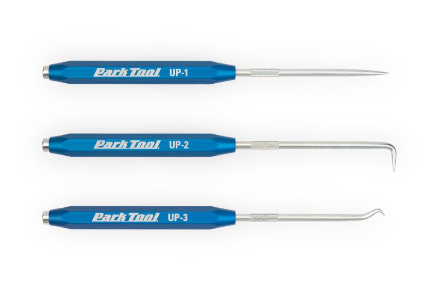 | Description | The Park Tool UP-SET is a set of three unique multi-purpose picks ideal for a wide variety of fine detail work performed on a bicycle, including removing O-rings and bearing seals, opening up pinched housing, and other scenarios where no other tool will do. The UP-SET includes a straight, hooked and 90 degree pick, so you always have the right pick for the job. The base of each anodized aluminum handle features a strong magnet, useful for retrieving and removing small items such as ball bearings, washers or fasteners, or for storing the picks on a repair stand or metal tool board. Each pick is replaceable, cold formed, heat treated and polished high carbon steel. UP-SET Features Aluminum handle with magnet Picks are replaceable, cold formed, heat treated and polished high carbon steel. Set includes 1-straight, 1-hook and 1-90 degree pick |