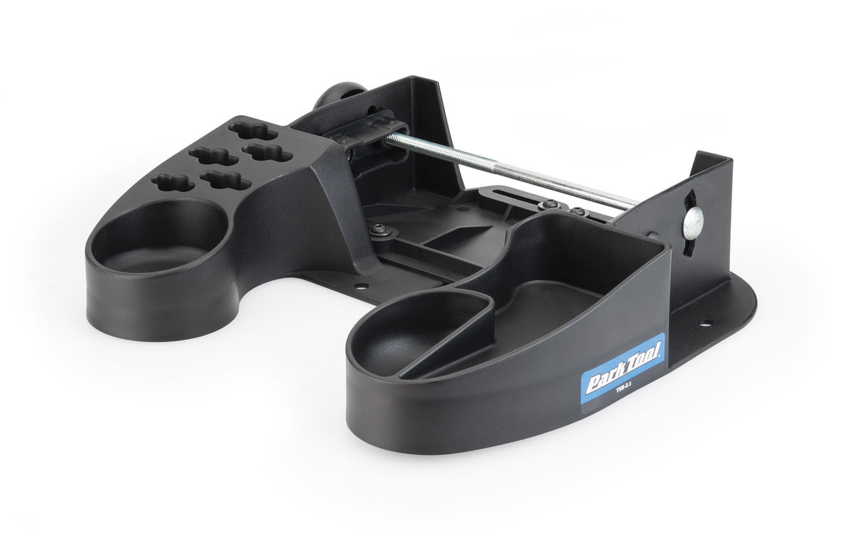 Description The TSB-2.2 securely installs onto any TS-2, TS-2.2, TS-2.2P, or TS-2.3 Professional Wheel Truing Stand and provides a wide, sturdy base that can be moved around or mounted to a workbench. The base allows the truing stand to tilt 20 degrees from front to back for comfortable wheel work and sight lines at any bench height. Features specially-shaped slots to hold spoke wrenches as well as parts trays for spoke nipples and other small components. Constructed from a durable composite material.