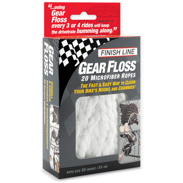 | Description | Finish Line Gear Floss is an advanced cleaning and detailing tool The microfiber rope is perfect for cleaning cassettes & hard-to-reach bike parts, such as front chain rings, derailleur pulley wheels, hubs and spindles, brake arms, bottom bracket / crank interface, and more Unlike other materials that simply move the dirt and grime around, the microfiber technology of Gear Floss attracts and traps it inside its star-shaped grooves Gear Floss is highly tear-resistant and it is washable 20 Ropes per PACK Each Rope is 20 in / 51cm |